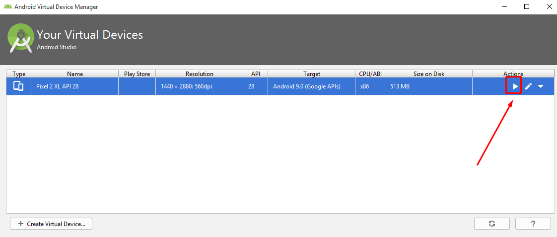 click finish Step 11: So, once the wizard closed you will be to the Android Virtual Device Manager, to start the Virtual Device which we created simply click on the play button and wait until Android Studio Starts on Android Virtual Device.