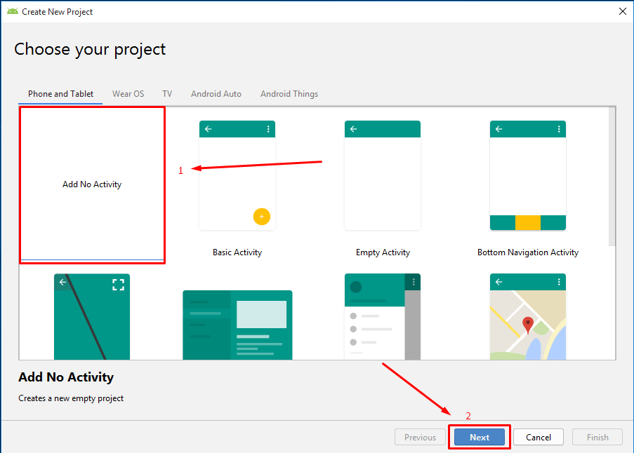 click Step 3: After creating a new project then select “Add no activity” then click on the next.