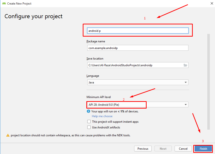 next Step 4: Now, configure your project then give name, select Android p from the minimum API level.