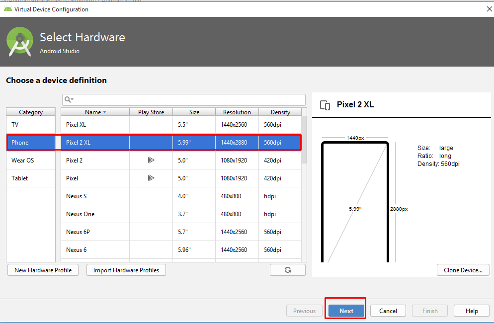 create virtual Step 7: Choose a Hardware module for the Android which you want to use. We recommend selecting Google Pixel 2 XL. Remember you can also choose a resolution for the android device which you are creating.