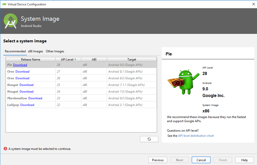 Step 8: When you choose an Android Hardware, now you have to download a system image for the device which you want to create. Since we are about to test the android P, but we recommend download install Android P.