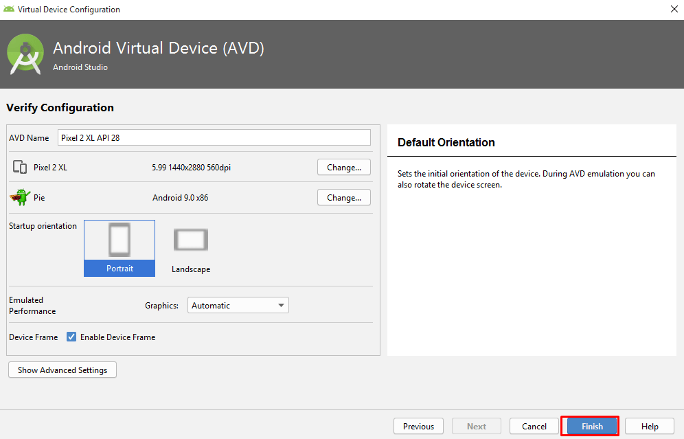 click on next Step 10: Now, Again for confirmation Android Studio will ask you that verify the below settings for the device which you created. If you don’t want, simply click on change and the settings, so if you’re ok with this setting then click finish, and the wizard will close.