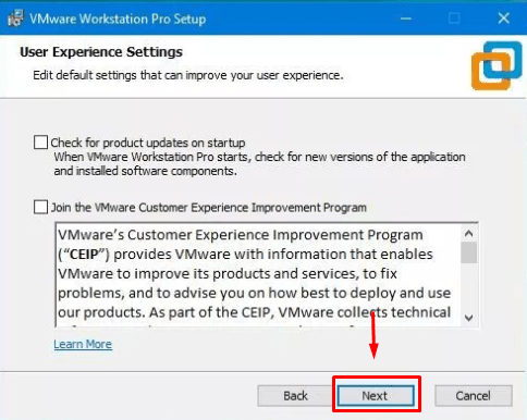 Step 4: Through the process, on the user experience settings, the updates and VMware customer experience will be checked by default, let them like that if you want.