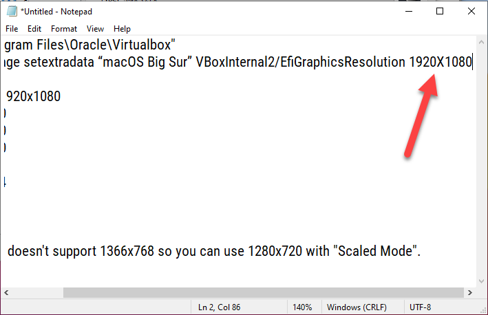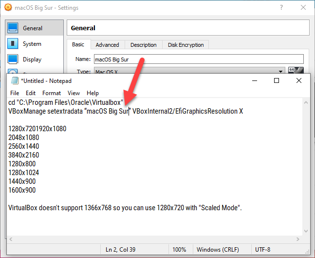 Once it is pated on the Notepad, you have to replace your Virtual Machine Name text with the name of your Virtual Machine which you have created. Keep in mind that the name should be correct otherwise, it won’t fix the macOS Big Sur screen resolution on VirtualBox.