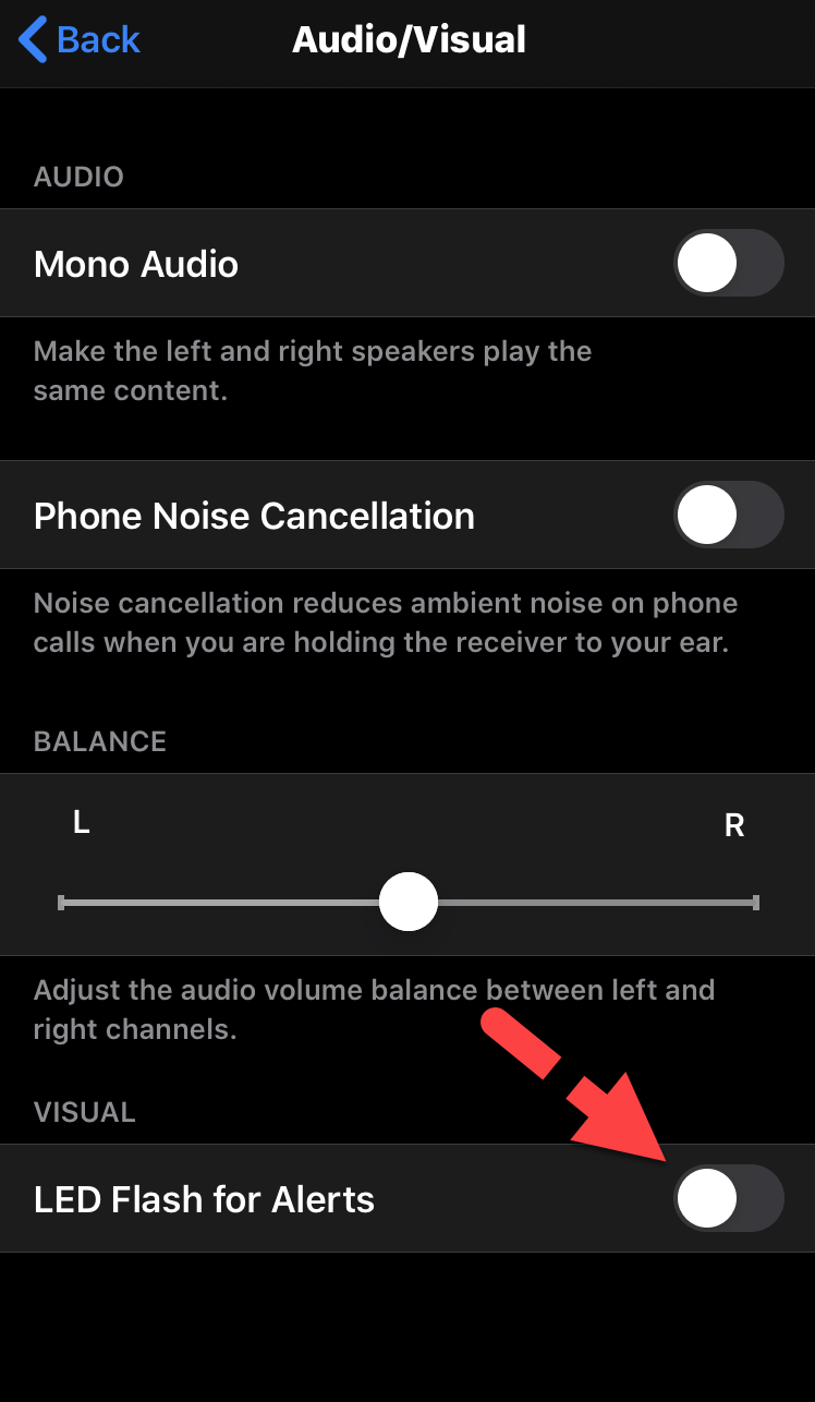 Audio/Visual Step 4. So, you need to turn on LED Flash For Alerts, make sure to switch it to the right by tapping on it. The toggle button should be green once you turned on.