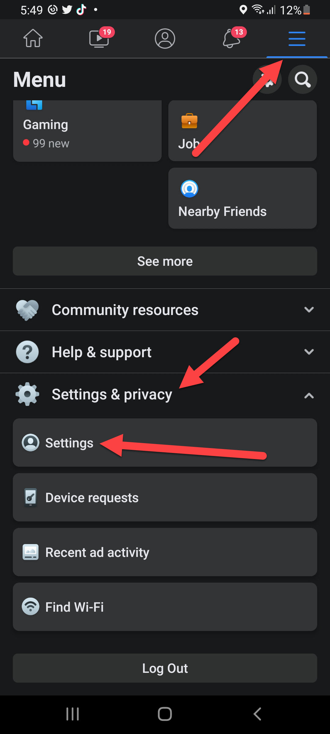 Step 2. Click on the Three Lines at the top right corner then select Settings & Privacy after that tap on the Settings.