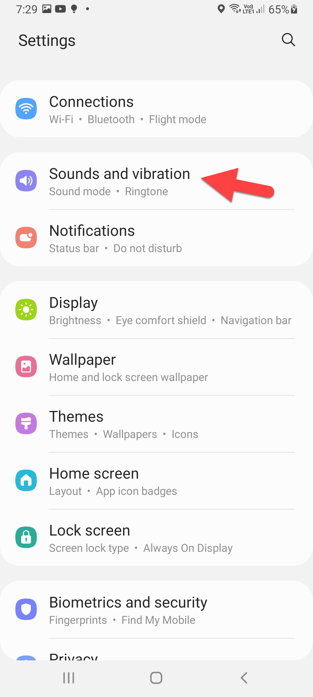 Step 2. Once the settings are launched then scroll down then click on the Sounds and Vibration.