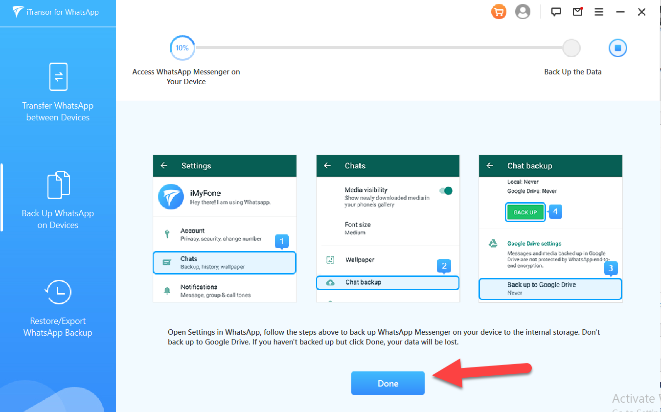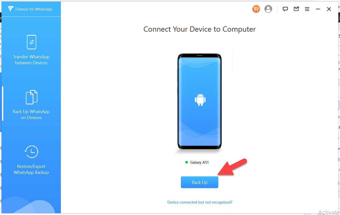 Back Up WhatsApp on Devices Step 2. Now, connect your mobile with the cable after that click on the Back Up.