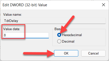Click on the DWORD (32-Bit) Value Step 4. Give a name to it as TdrDelay. double-click on the TdrDelay set its value to 8 and select Hexadecimal in the section of the base.