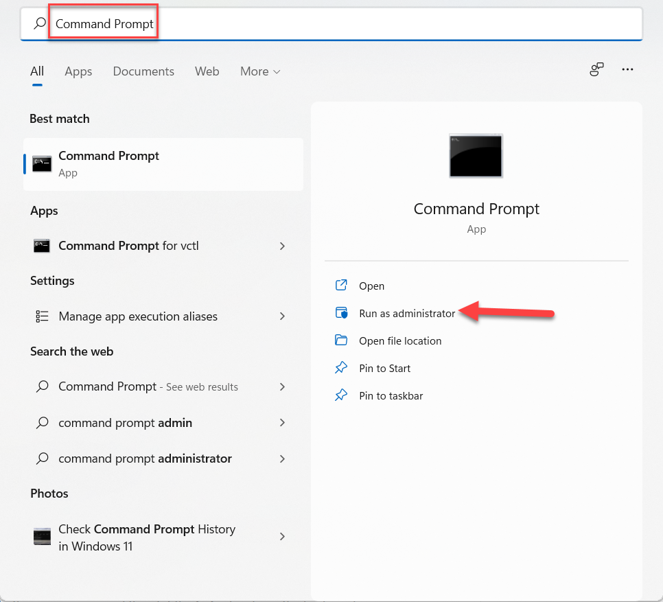 Step 1. At first, press or hold Windows + S to open the search section then search for Command Prompt after that click on the Run As Administrator from the right side.