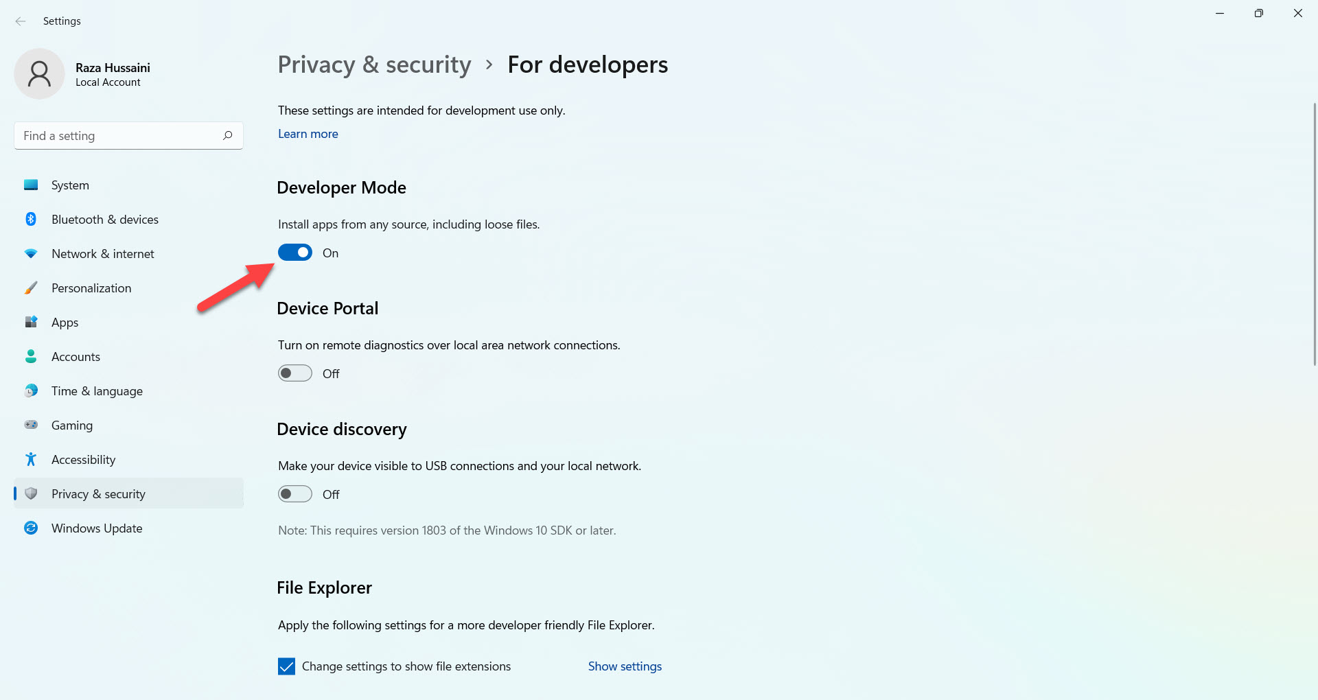 Step 2. When the developer system is open then turn on the toggle of Developer Mode.