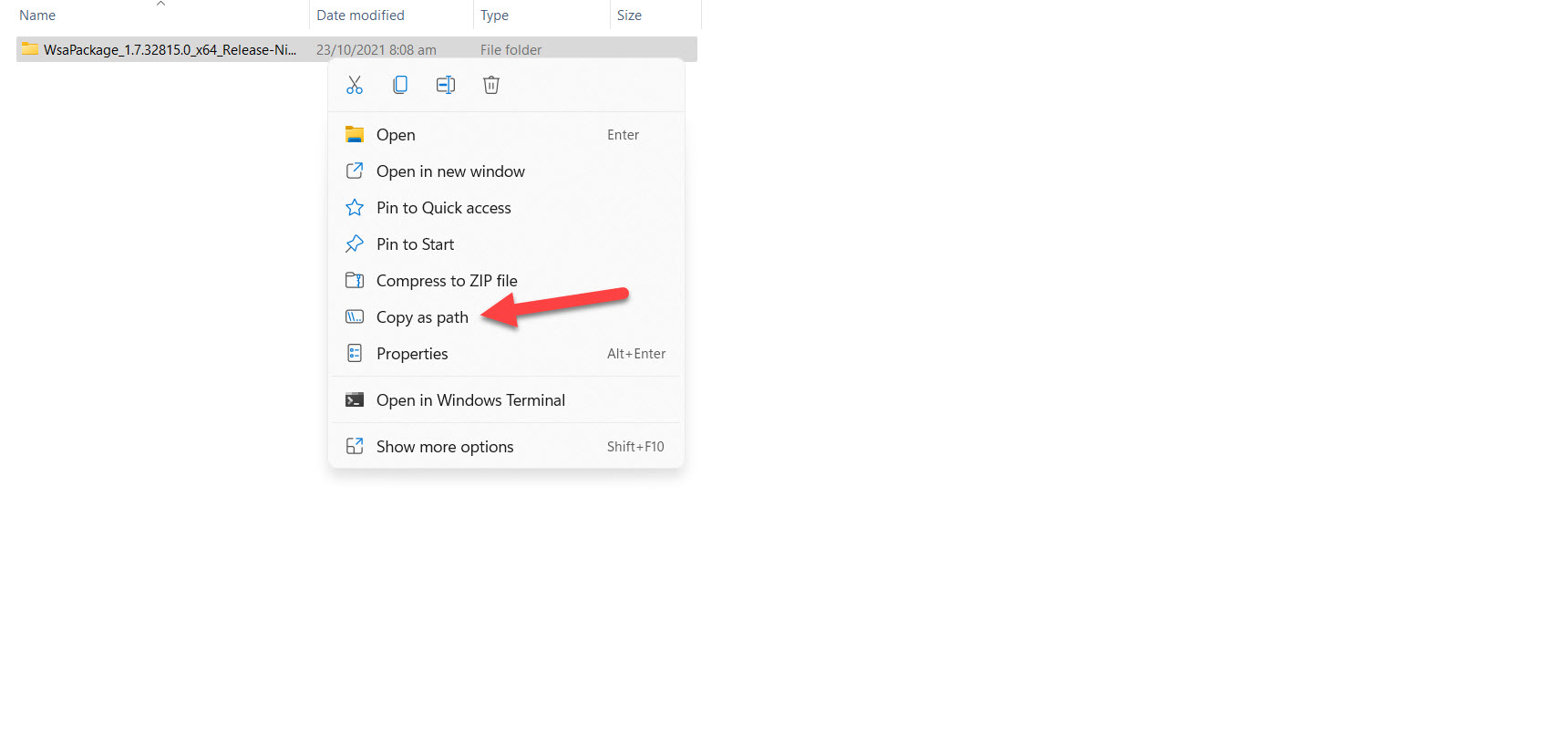 Step 4. Once the folder is open then right-click on the WSA Package file after that select Copy As Path.