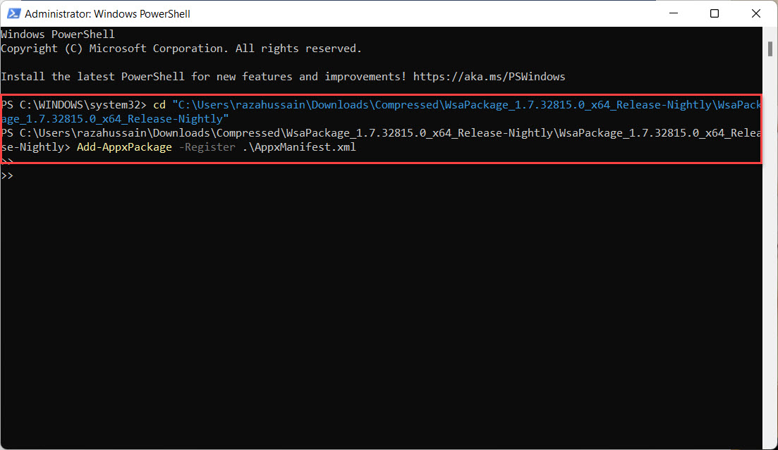 Step 6. Type Cd after that paste the path of the WSA Package then hit the Enter button.