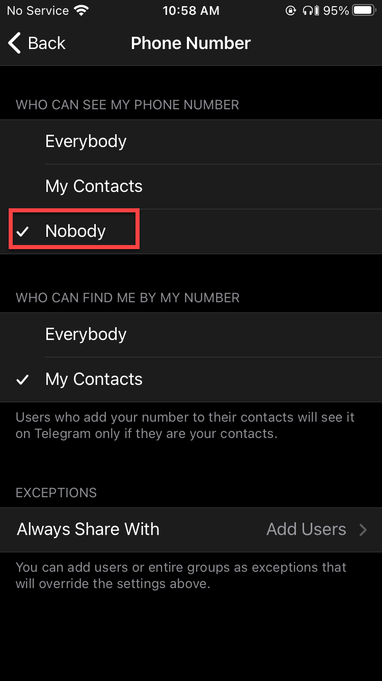 Click on the Phone Number Step 5. At last, on the option of who can see my phone number you just select Nobody.