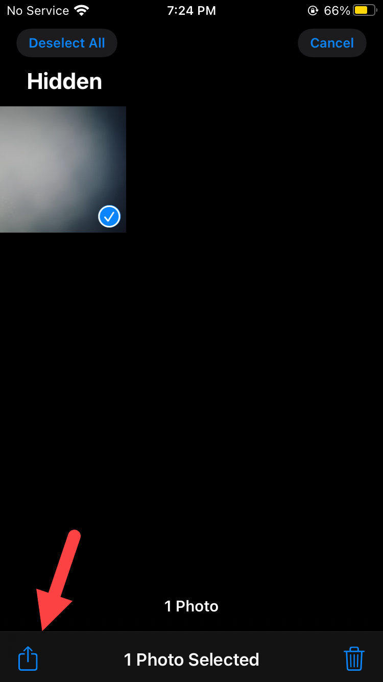 Click on the Hidden Step 2. Select the hidden photo then click on the Share.