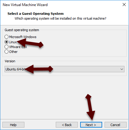 guest operating system installation Step 4: After that, choose the guest operating system, the version you need to select Linux and version choose Ubuntu-64bit. Click on next button.