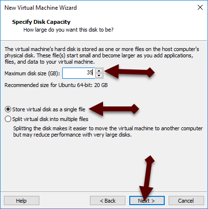 Step 6: In this step, specific the disk capacity up to 35GB to work better and choose a store virtual disk a single file.