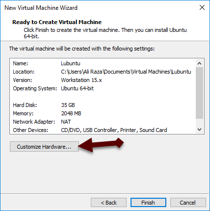 Step 7: Now, click on the customize hardware in order to customize the setting of the virtual machine for Lubuntu.