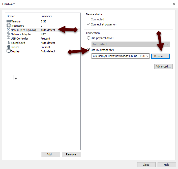 processor tab Step 9: After that, click on the New CD/DVD (sta), select the use iso image file, then click browse and choose the Lubuntu which you have downloaded the Lubuntu iso file above. And click close.