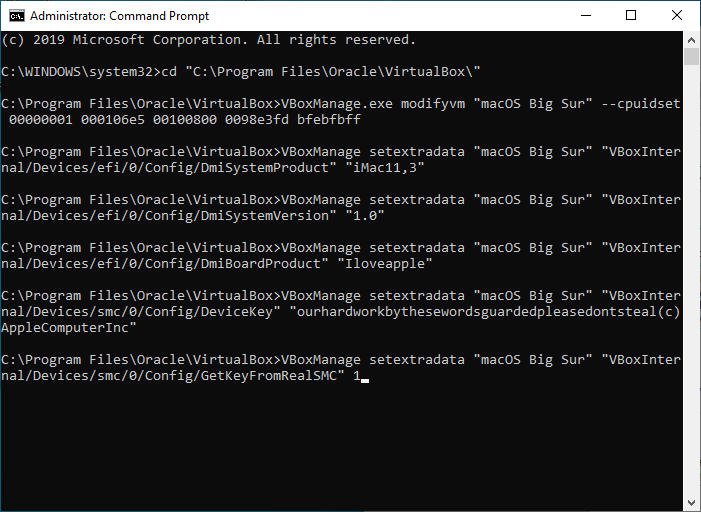 When you have created a new virtual machine and customized it properly. It is time to run some VirtualBox Code in Command Prompt. It will help and allow the VirtualBox in order to install macOS Big Sur on it.