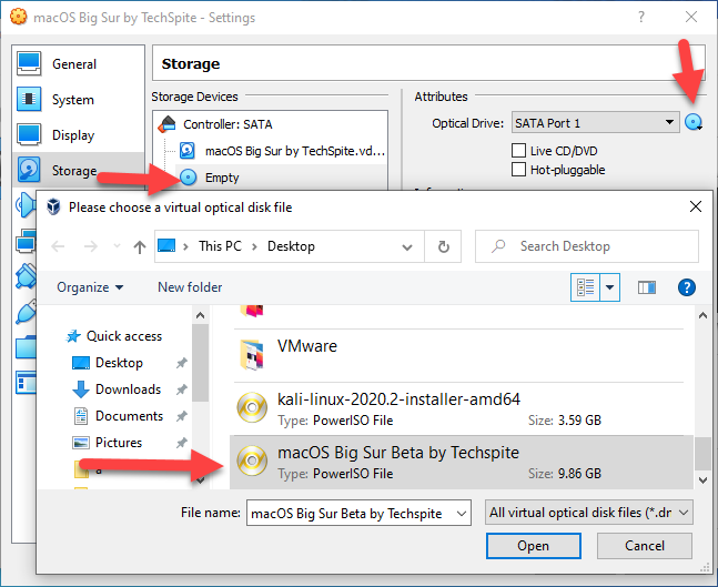 Video Memory 3. Now, it is time to add the macOS Big Sur ISO file to the virtual machine, navigate to the Storage menu, and select Empty. Then click on the DVD icon and choose your macOS Big Sur ISO File which you have downloaded.