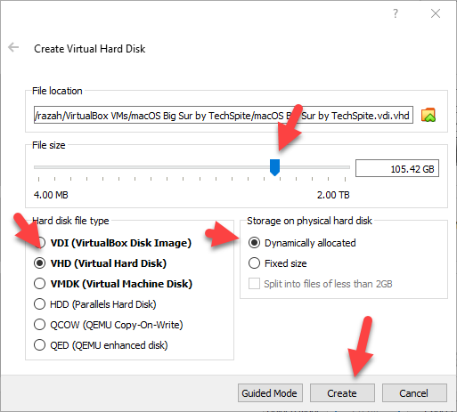 Create 4. Increase the memory size of up to 100GB or more than that to have a better performance. From the Hard disk file type section, you have to select VHD (Virtual Hard Disk), from the right side you have to select Dynamically allocated and click Create.