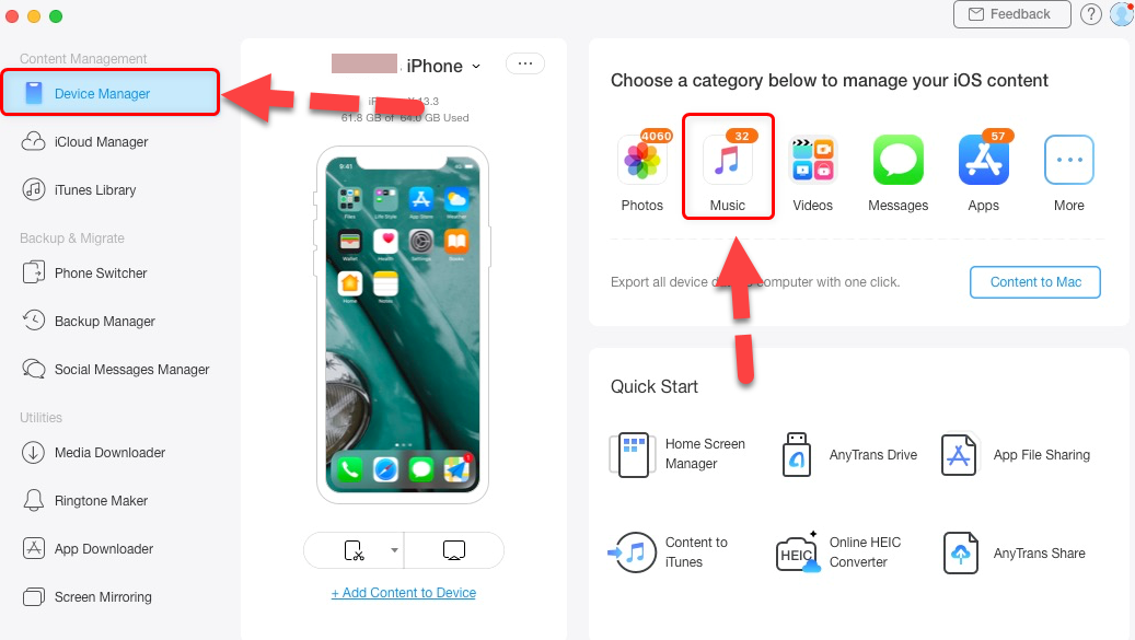 Once you have successfully installed on your computer. After that. you need to run AnyTrans for iOS, make sure to connect your iPhone without your PC. And click on the device manager then select Music for the right side box.