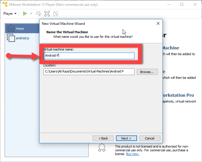 select the iso file Step 3: Give the name to your virtual machine as I will give the name Android P. Then click next.