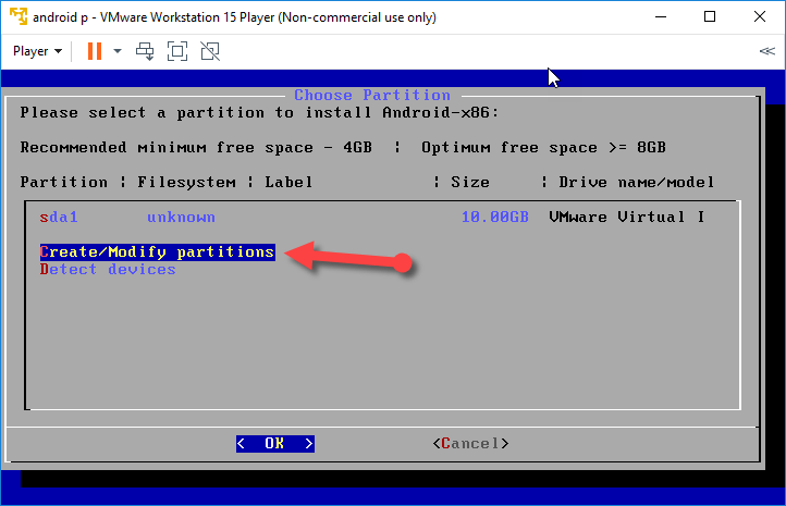 no Step 8: After that, it will be loading for a while then you will get a new window then click on the Create/modify partitions. Then Enter.