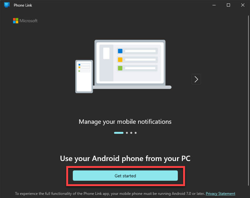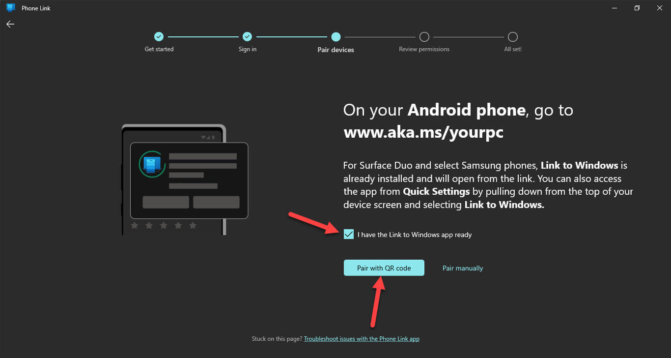 Get Started Step 4. Now, check the box of I Have the Linked to Windows App Ready and click on the Pair With QR Code.