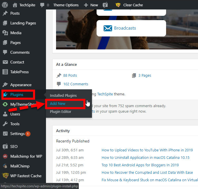 Step 1. For installing the AMP plugin you need to login into your WordPress. Then go the dashboard of your WordPress then scroll down, find plugin option and click on the Add New.