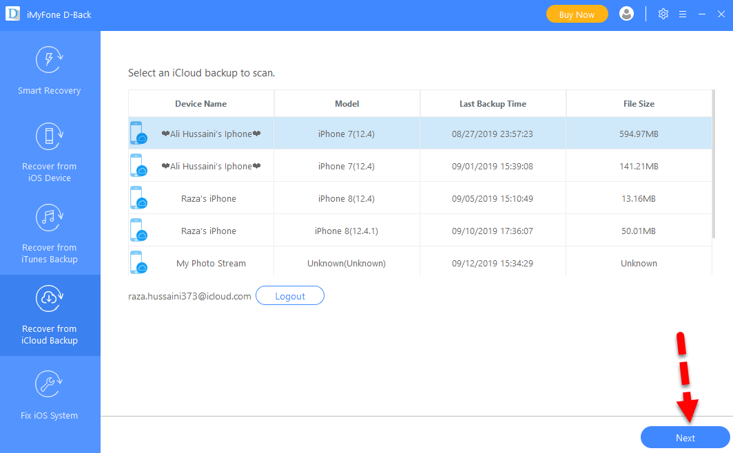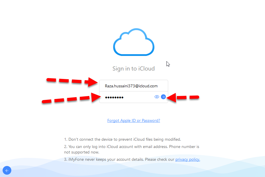 Recover from iCloud Backup Step 4. After that, a new window will be opened, you will be asked to sign in to your iCould. You have to enter your email and password because it is the most important otherwise you won’t be able to recover your deleted photos. And click on the arrow button in order to continue recovering the deleted photos.