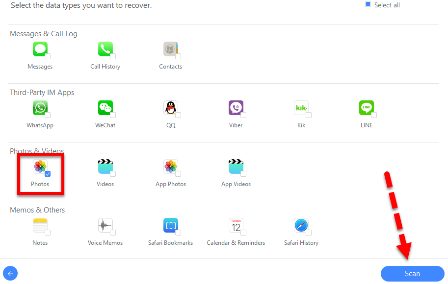 Select an iCloud backup to scan Step 7. When you choose the iCloud backup, in the next windows you will be asked to the data types you want to recover. So, you can see that you can recover various data but our aim is to back up the photos from iCloud. Then click scan to continue.
