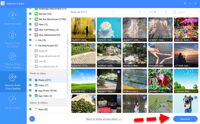 Select the data types you want to recover from iCloud Step 8. After downloading, it will display all the photos present in the backup file in its preview window. From the same window, you can pick the images that you wish to recover to your computer. And transfer that photos back to your iPhone by connecting your device to the computer.