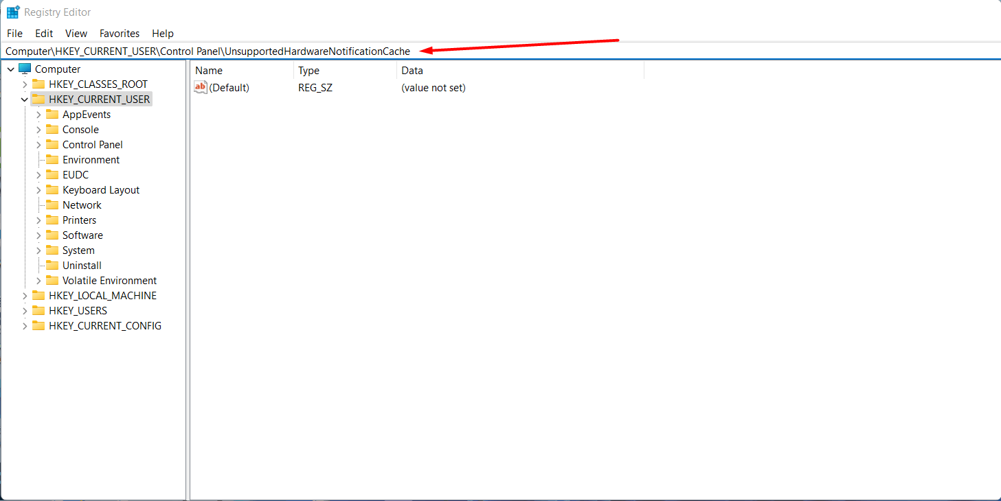 HKEY_CURRENT_USER\Control Panel\UnsupportedHardwareNotificationCache
