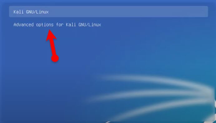 First of all, you have to Power on the Kali Linux until you get the GNU Grub window. There you will see two different options. Therefore, use the down arrow key to select Advanced options for Kali GNU/Linux.
