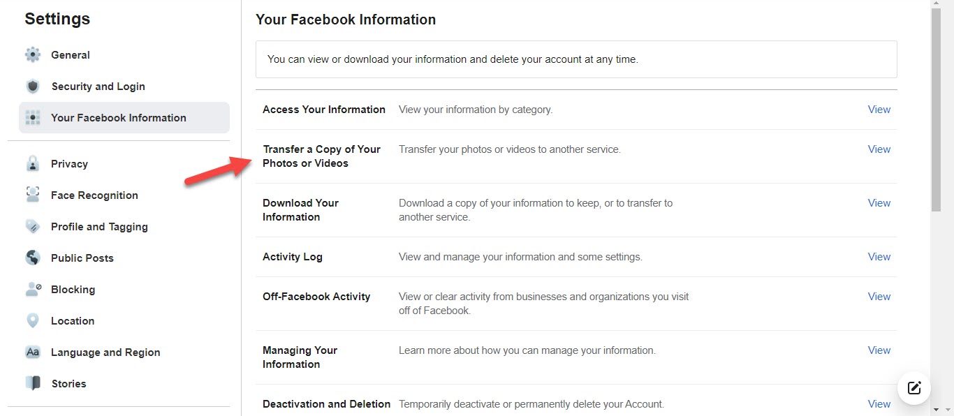 Tap on the Your Facebook Information Step 6. Here you need to tap on the Transfer a Copy of Your Photos or Videos.