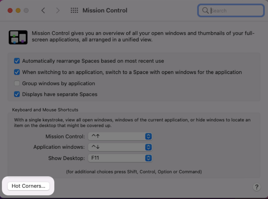 Head Towards Mission Control Step 3. Now, when the mission control is open then click on the Hot Corners at the left bottom corner.
