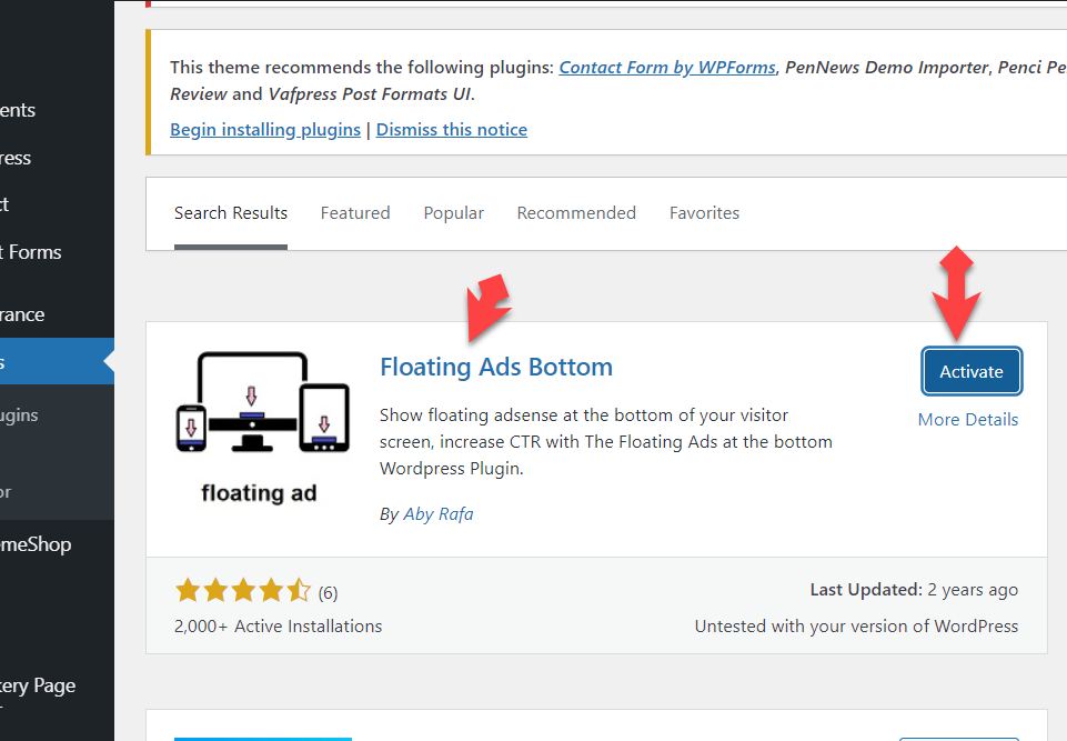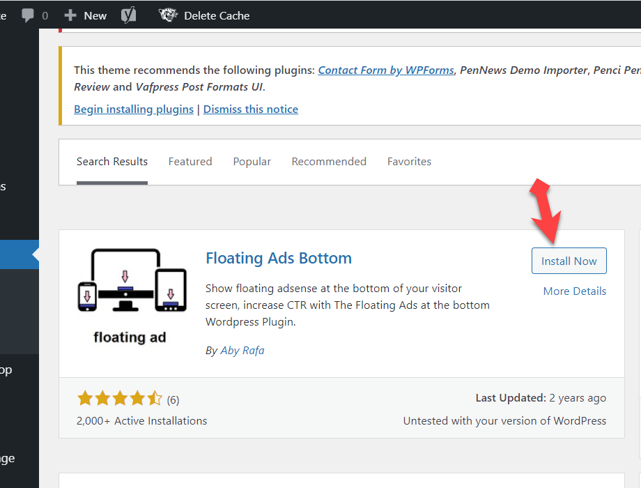 Floating ads bottom Step 3. Scroll down and find out the Floating ads bottom plugin exactly which is shown on the screenshot down below. And click Install.