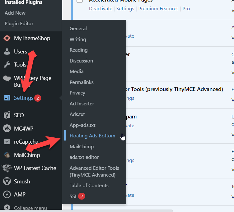Activate Step 5. Once it is successfully activated, from the left side click on Settings, and select the recently installed plugin which is Floating Ads Bottom.