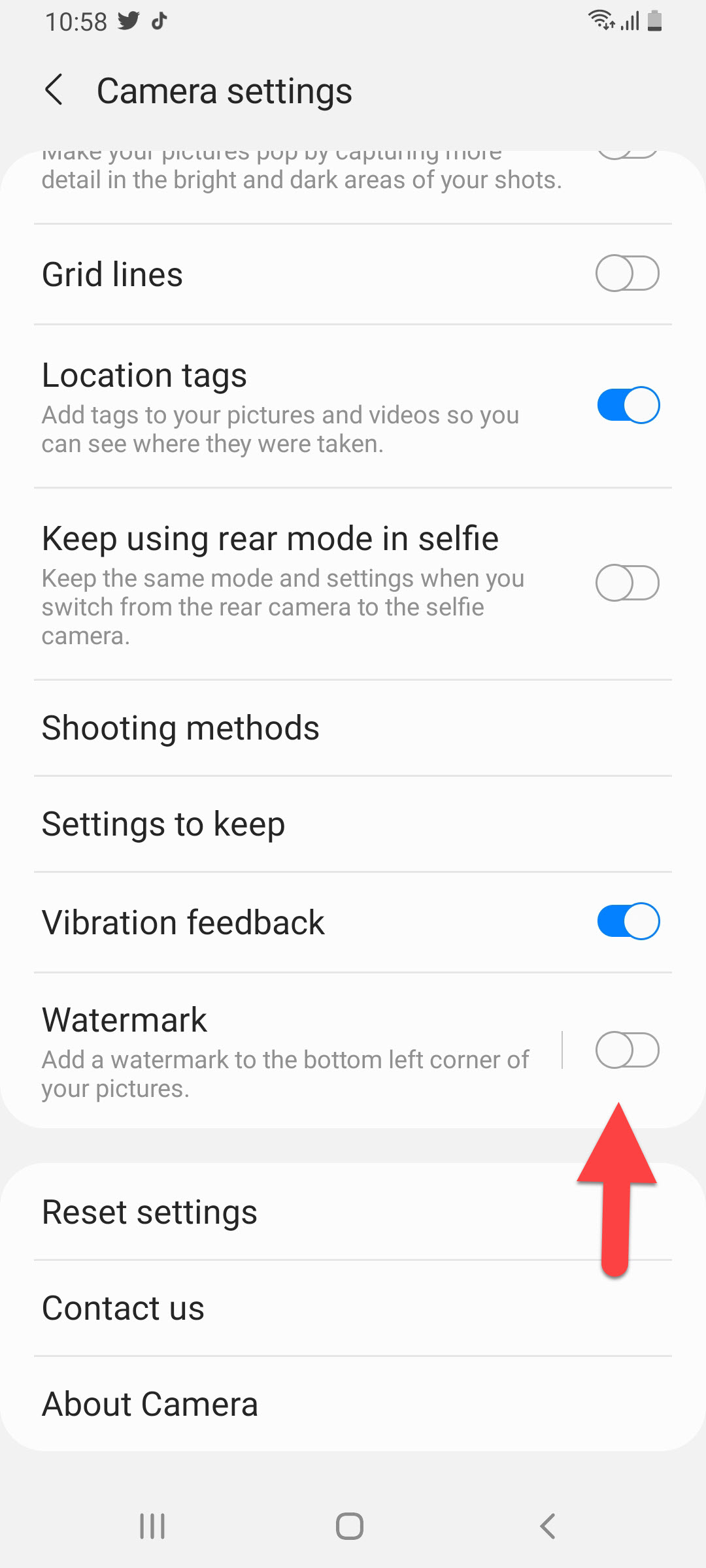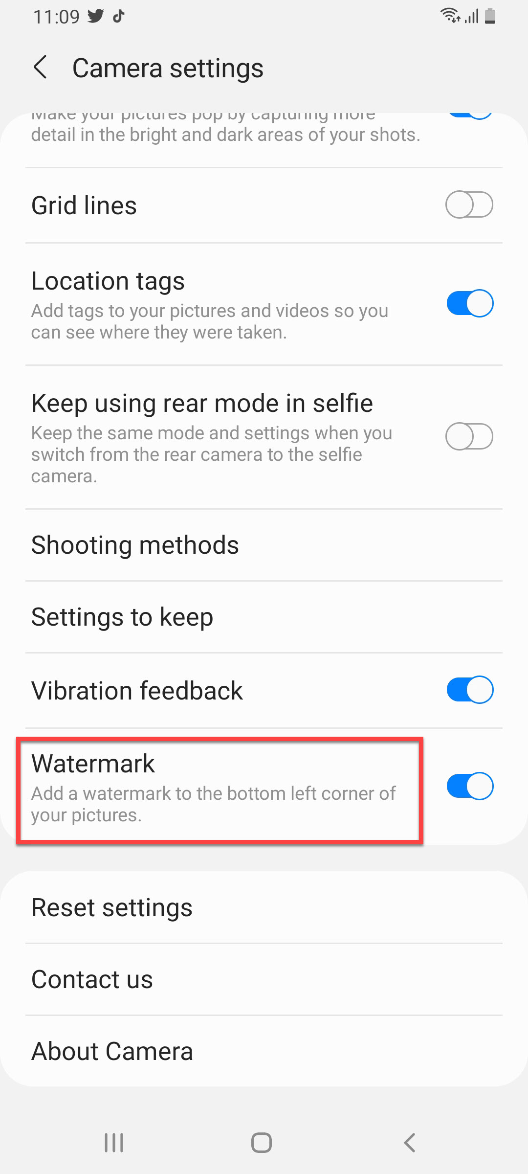 Click on the Settings Step 2. When the camera settings are open then scroll down to the bottom after that turn on the toggle of Watermark.