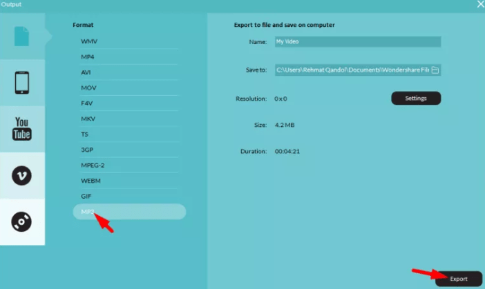 Step 9. In this step you have many choices to convert your video but as we want to convert video to mp3 so select MP3. then if you want to change name and place then you can do it with these two options that located on the right side of your hand. after selecting the format then click on the export button.