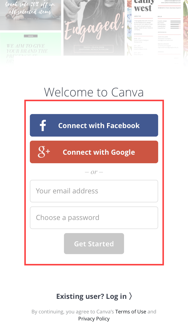 Install the Canva app Step 2. When the installing process is done, you need the Canva app then create an account or log in with your Facebook or Google account.