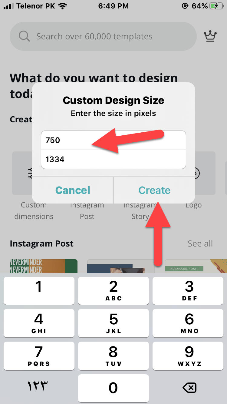 Enter the suitable size in pixel Step 5. Then, if you want to create a proper to your blank canvas, you need to add a variety of elements for example, text, picture, template, etc. By tapping on the + icon which is located at the right corner of the app.