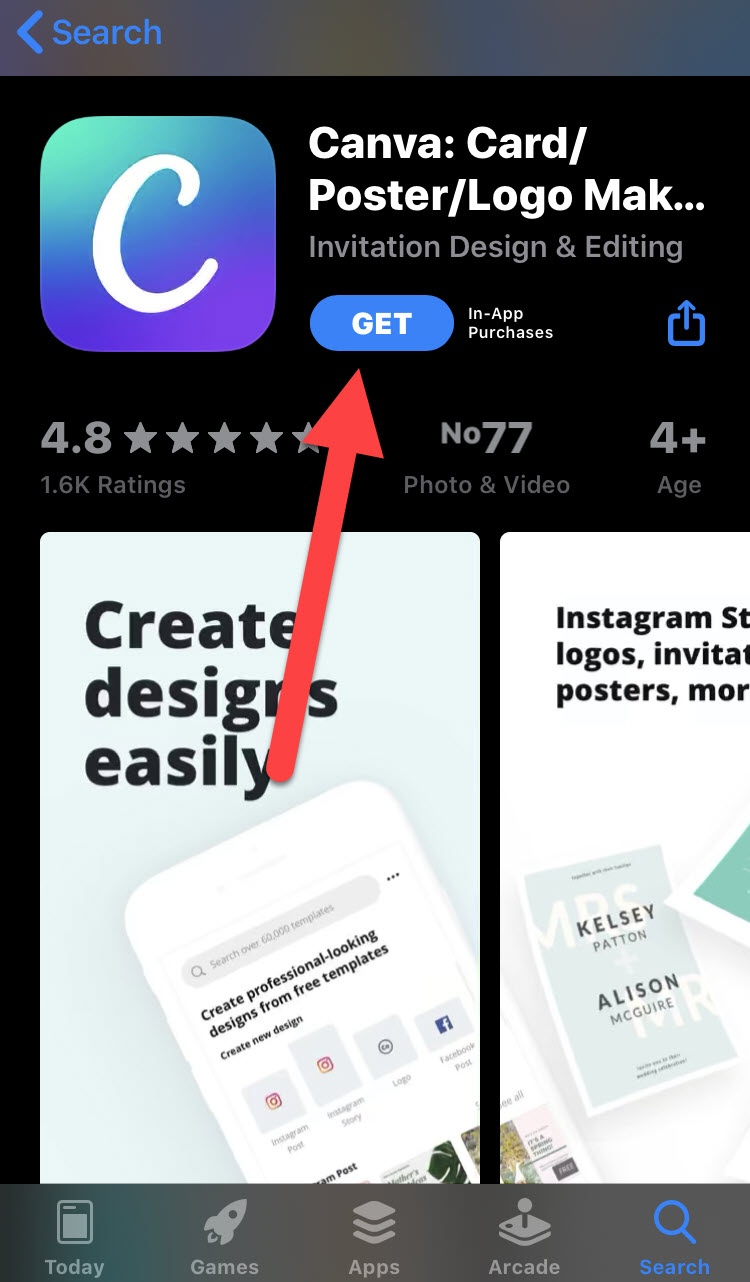 Step 1. Then in order to install the Canva app, you need to open the app store first, after that you have to search Canva by tapping on the search bar. Further, you have to tap on Get in order to be installed.