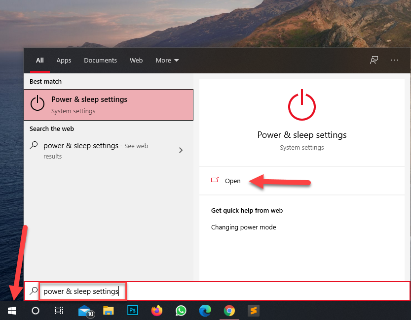 Step 1. At first, click on the Start Menu at the bottom left corner then type Power & Sleep Settings after that click on the Open.