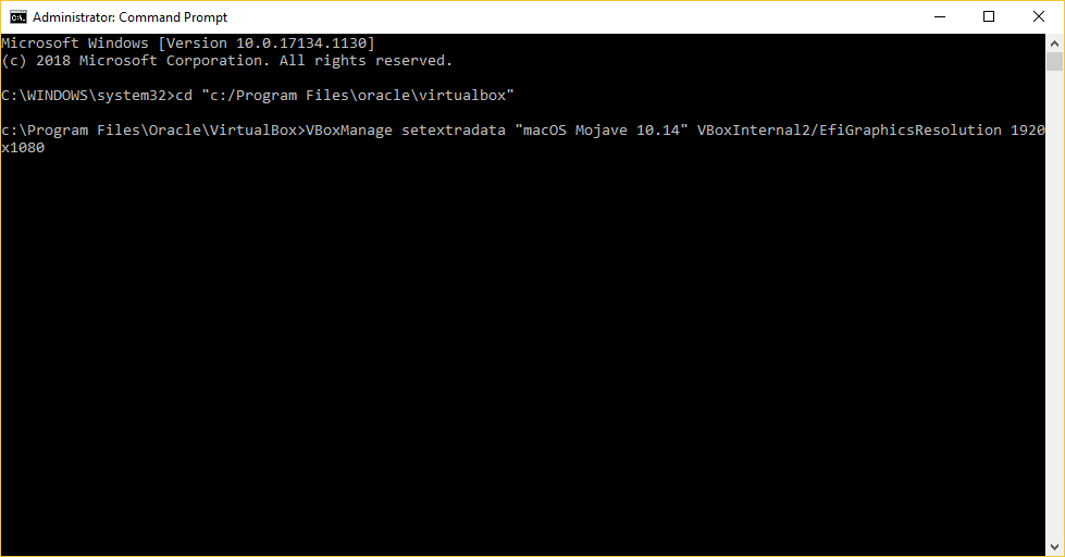 VBoxManage setextradata “macOS Mojave 10.14” VBoxInternal2/EfiGraphicsResolution 1920×1080