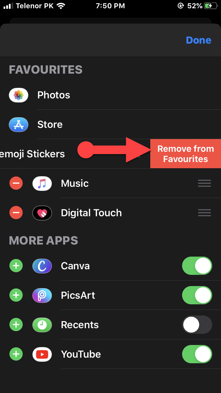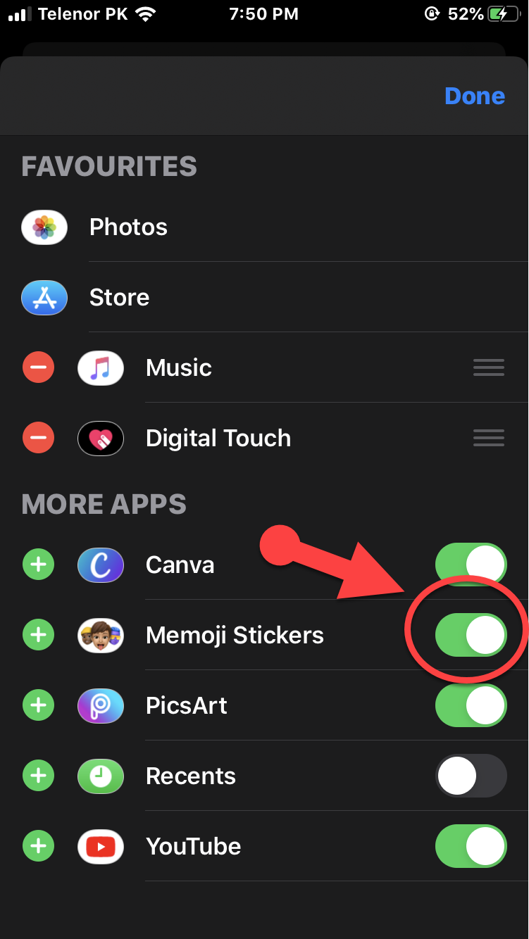 Remove from Favorites Step 6. Finally, scroll down in the More Apps list and toggle off the Memoji Stickers and tap on Done.