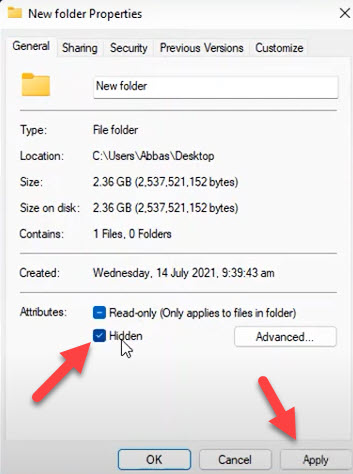 Go to the Properties Step 5. Then uncheck the box of Hidden then click on the Ok.