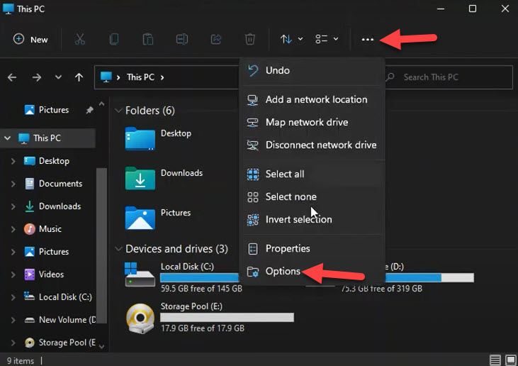 Step 1. At first, open the This PC on your PC after that tap on the Three Dots then select the Options.